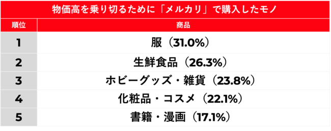 1. メルカリ利用者の約96%は物価上昇の影響を受けており、物価高を乗り切るために「メルカリ」でおトクに購入したモノランキング