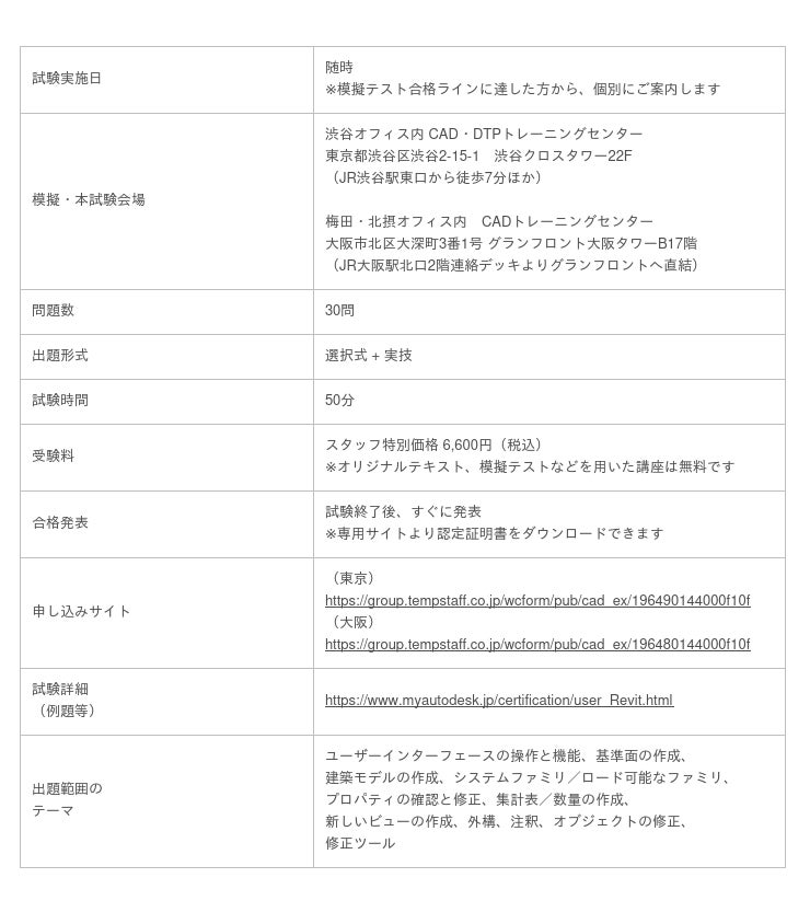 オートデスク社認定のRevit Architectureユーザー資格は、Revitの初級ユーザー向けの認定資格であり、基本知識と操作技術を有することを証明できる世界共通の資格です。パーソルテンプスタッフは、オートデスク社認定スクールとして、オリジナルテキストや模擬テストなどを用いた認定資格プログラムの無料講座を東京と大阪*6に開設しました。