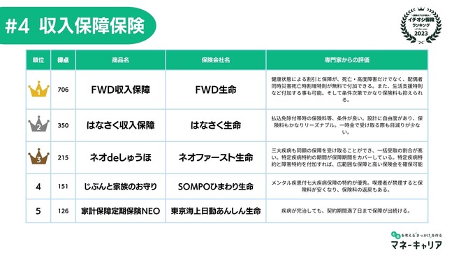 収入保障保険ランキングでは、FWD生命の「FWD収入保障」が1位に輝きました。