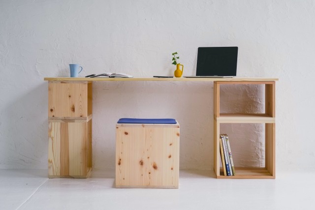 シンプルな4つのサイズの木の枠とジョイントパーツの小さな木片からなる国産木材の家具。