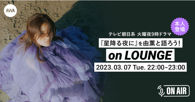 AWA株式会社(本社:東京都港区、代表取締役CEO:冨樫晃己)が運営する、サブスクリプション型(定額制)音楽ストリーミングサービス「AWA(アワ)」は、2023年3月7日(火) 22:00~23:00の 60分に渡り、オンライン空間「ラウンジ」で、テレビ朝日系 火曜夜9時ドラマ『星降る夜に』 を由薫と語ろう!AWAラウンジを開催いたします。