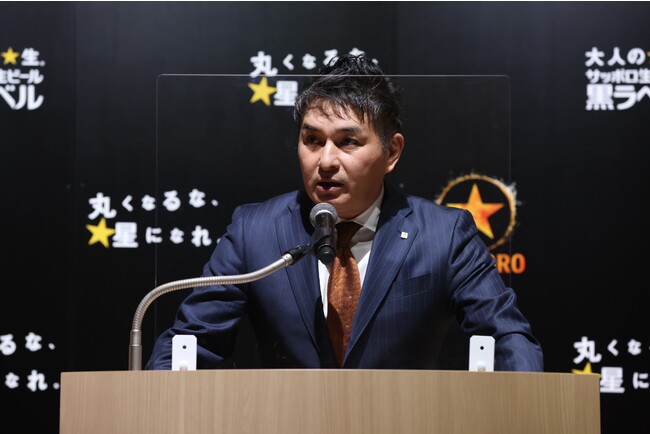 イベント冒頭には、サッポロビール(株)マーケティング本部 ビール&RTD 事業部部長 武内亮人氏より、「サッポロ生ビール黒ラベル」の販売動向や23年度のブランド戦略について説明を行いました。