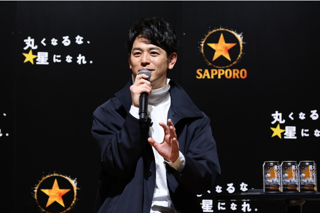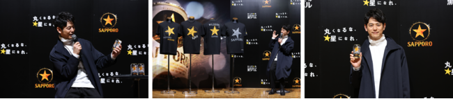 また、「サッポロ生ビール黒ラベル」TVCMに13年間出演されている妻夫木聡さんにご登壇いただき、新CMや数量限定発売のオリジナルメッセージ缶のお披露目、新生活シーズンに新たな挑戦をする大人の方へのメッセージなどをいただいたほか、新TVCM公開と合わせて展開する「STAR POINTキャンペーン」の第1弾賞品、WILDSIDE YOHJI YAMAMOTOとのコラボレーションTシャツのお披露目も行いました。