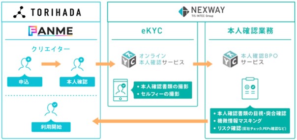 TISインテックグループの株式会社ネクスウェイ(本社:東京都江東区、代表取締役社長:松森正彦、以下ネクスウェイ)は、株式会社TORIHADA(本社:東京都渋谷区、代表取締役社長 兼 CEO:若井映亮、以下 TORIHADA)が提供するクリエイター向けマネタイズプラットフォーム「FANME(ファンミー)」に、KYC※1業務ソリューションとして「オンライン本人確認サービスeKYC」、「本人確認BPOサービス」が導入されたことを発表します。