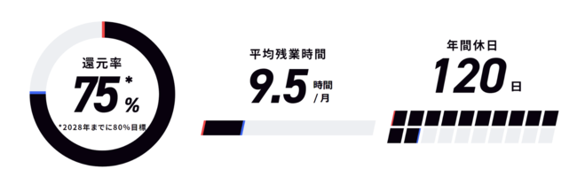 三木:まずは、報酬です。弊社は報酬体系に透明性を持たせています。一般的なSES企業ですと、受託費はエンジニアには明かさない事が多いです。ですが、弊社はエンジニアに伝えます。そして業界平均 60% 前後と言われているエンジニア単価還元率を弊社では 75% です。2025 年 は 78~80%を目指しています。