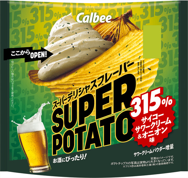 『スーパーポテト サイコーサワークリーム&オニオン味』は、通常の「サワークリーム&オニオン味」に比べ、サワークリームパウダーを315%配合した、サイコー(315)に濃厚な味わいが楽しめる厚切りポテトチップスです。これまでの「スーパーポテト」シリーズの中でも最大級に濃い味わいが特長で、通常の「サワークリーム&オニオン味」では物足りない濃い味好きのお客様のために開発しました。後味の旨みを引き出す香料「フリス(R)」を使うことで、旨みが食べ進めた後からグッと押し寄せます。内容量は通常の「サワークリーム&オニオン味」(56g)に比べて大容量(70g)で、パッケージは底面にマチを作ることで袋が自立し、倒れない“ながら食べ”にぴったりな包装形態としました。毎日お酒を飲んでストレスを発散している方々に、お酒のお供として楽しんでいただきたい商品です。