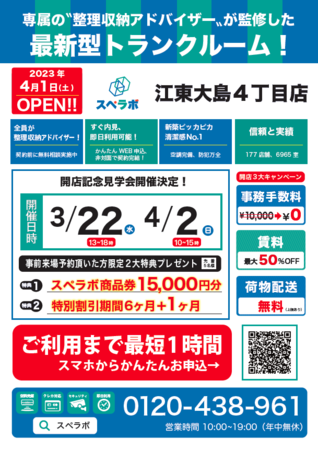 【江東大島4丁目店/4月1日(土)オープン】見学から契約、解約まで完全非接触・非対面、お申し込みからご利用まで最短1時間!都内、大阪などにて絶賛運営中のトランクルーム【スペラボ】が西大島駅近くに出店!