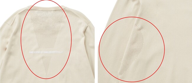 今回発売するアイテムは、当社の独自理論に基づいた、汗をかきやすい部分の通気を考慮したメッシュ状の編み目で快適な着心地を感じられます。加えて身頃が無縫製のため内側に縫い代による肌当たりがないうえに、縫い目による伸び止まりがないため快適な”伸び”を実現。また、素材と製造過程で環境負荷を軽減し、環境にも配慮しています。