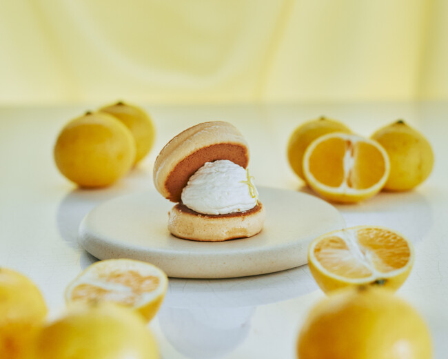 伝統製法の本みりんを使用したしっとりエアリーな生地に、カカオのフルーツビネガーと湘南ゴールドの果汁を加えた爽やかな生クリーム、北海道産の粒あんを挟みました。