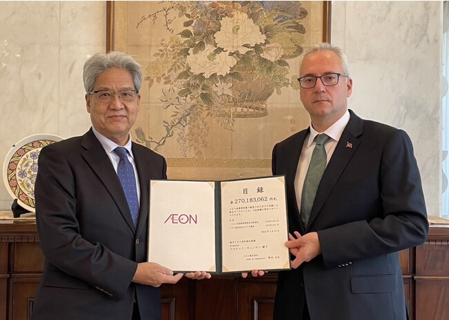 イオンは2月8日(水)から2月26日(日)の期間、全国のグループ店舗で緊急支援募金を実施し、計1億6,509万1,531円をお寄せいただきました。これに、イオン株式会社からの支援金1億509万1,531円を加えた2億7,018万3,062円を、3月10日(金)に駐日トルコ共和国大使館に寄付いたしました。