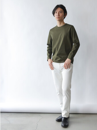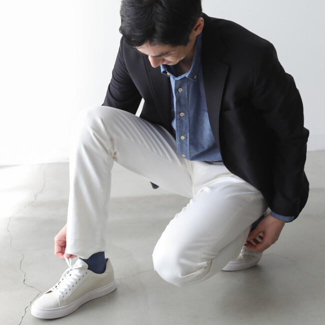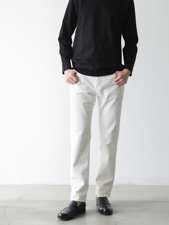 これにより、カジュアルからジャケットを羽織ったきれいめな装いまでマッチする、着回し力の高いパンツです。