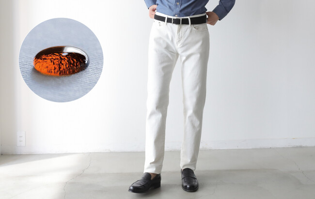 水はもちろん、ワインやコーヒーなどの液体汚れを弾くホワイトパンツを開発しました。