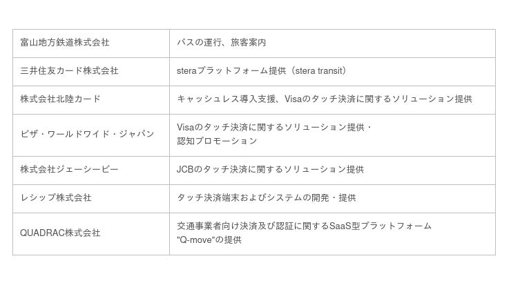 富山地方鉄道株式会社(本社:富山県富山市、代表取締役社長:辻??川 徹)、三井住友カード株式会社(本社:東京都江東区、代表取締役社長:大西 幸彦)、株式会社北陸カード(本社:富山県富山市、代表者:南 直樹)、ビザ・ワールドワイド・ジャパン株式会社(本社:東京都千代田区、代表取締役社長:スティーブン・カーピン)、株式会社ジェーシービー(本社:東京都港区、代表取締役会長兼執行役員社長:浜川 一郎)、レシップ株式会社(本社:岐阜県本巣市、代表取締役社長:杉本 眞)およびQUADRAC株式会社(本社:東京都港区、代表取締役社長:高田 昌幸)は、富山地方鉄道株式会社が富山市内で運行する路線バス「富山空港直行バス」において、三井住友カードが提供する公共交通機関向けソリューション「stera transit」を 2023年3月20日より導入し、Visa・JCBのタッチ決済が利用可能になることをお知らせいたします。