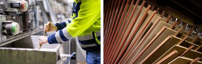 クライメートフットプリント削減を目指すイケアの主要アプローチの一つが、新たな接着剤を見つけることです。そして、接着剤をもっとも消費するのが板材の製造時です。イケアは、数年にわたる技術革新と実験を経て、現在、バイオ接着剤への切り替えを進めています。これにより、化石原料ベース接着剤の使用量を40%削減、接着剤によるクライメートフットプリントを30%削減することを目指します。