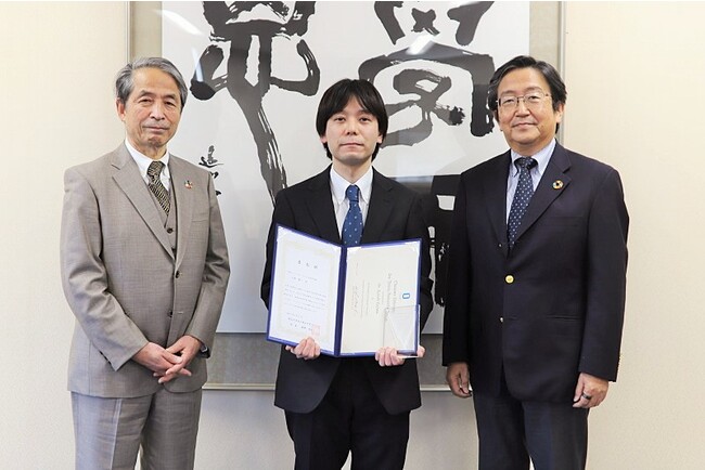 式では、槇野博史学長が表彰状と記念品を手渡し、那須保友理事・副学長(研究担当)とともに和やかな懇談会を行いました。槇野学長は「今回の受賞がゴールではないので、これを一つのきっかけとしてさらに研究を深めていただき、更なる高みを目指してほしい。岡山大学は、研究大学として、さらなる研究力強化と発展を目指しているので、次世代を担う若手人材の中心として、社会的・国際的にもさらにご活躍してほしい」と激励しました。