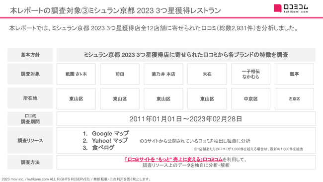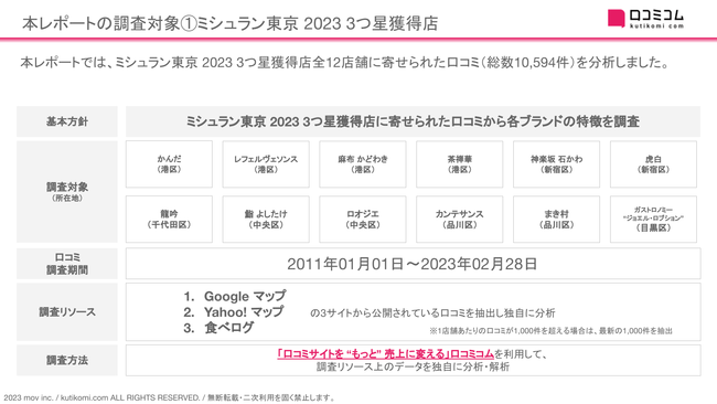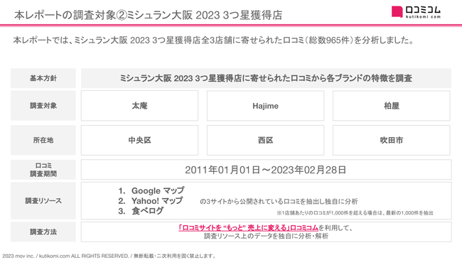 レポートをくわしく見る(無料)→ https://academy.kutikomi.com/whitepapers/202303_threestarrestaurants/?utm_source=pressrelease&utm_medium=prtimes&utm_campaign=202303_threestarrestaurants■ 本レポートの調査対象