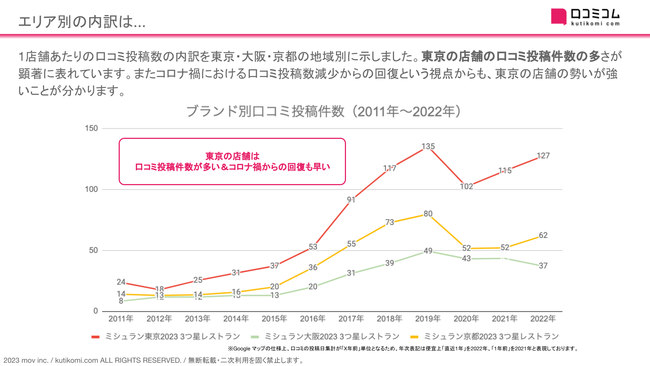 本レポートでは、ミシュラン2023 東京・大阪 ・京都 3つ星獲得店全21店舗に寄せられた口コミ(総数14,490件)を分析しました。レポートをくわしく見る(無料)→ https://academy.kutikomi.com/whitepapers/202303_threestarrestaurants/?utm_source=pressrelease&utm_medium=prtimes&utm_campaign=202303_threestarrestaurants■ 口コミ数の推移をエリア別に見てみると...