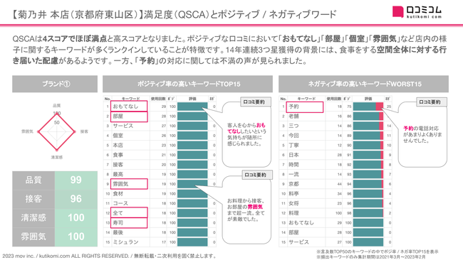 口コミコムの独自AIでは、口コミ内の特定の「キーワード」が利用された文脈(ポジティブ / ネガティブ)を判定します。さらに、口コミから顧客満足度(QSCAスコア)を算出します。口コミを可視化することで、自店舗の強み / 弱みや競合との差別化ポイントの把握に繋がります。今回は、このAI解析を用いて【菊乃井 本店】