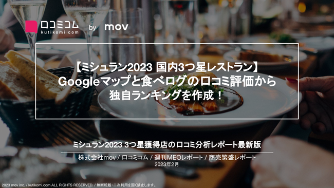 ”といったキーワードにおいても同様に分析しています。詳細は資料ダウンロードにてご確認ください。レポートをくわしく見る(無料)→ https://academy.kutikomi.com/whitepapers/202303_threestarrestaurants/?utm_source=pressrelease&utm_medium=prtimes&utm_campaign=202303_threestarrestaurants■ 口コミサイトを”もっと”売上に変える「口コミコム」とは