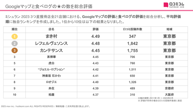 が顕著に表れています。またコロナ禍における口コミ投稿数減少からの回復という視点からも、東京の店舗の勢いが強いことが分かります。他にもレポートでは口コミサイト別に口コミ投稿数を分析しています。詳細は資料ダウンロードにてご確認ください。レポートをくわしく見る(無料)→ https://academy.kutikomi.com/whitepapers/202303_threestarrestaurants/?utm_source=pressrelease&utm_medium=prtimes&utm_campaign=202303_threestarrestaurants■ Googleマップと食べログの★の数を総合分析し、ランキングにしてみると…