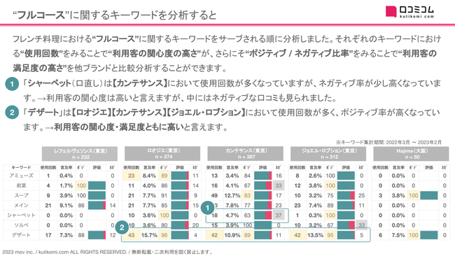についても分析しています。ダウンロードして、是非ご確認ください。レポートをくわしく見る(無料)→ https://academy.kutikomi.com/whitepapers/202303_threestarrestaurants/?utm_source=pressrelease&utm_medium=prtimes&utm_campaign=202303_threestarrestaurants■3つ星獲得フレンチレストラン5ブランドを共通キーワードで比較してみると...