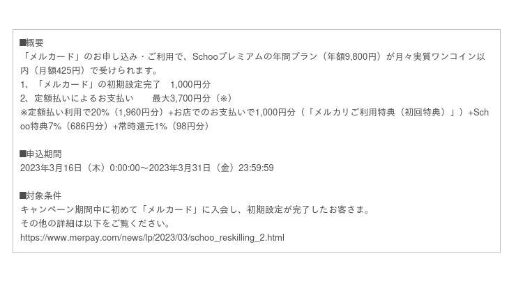 また、特別特典としてスクーと共同で、「みんなのリスキリング」の提供を開始いたします。本特典と「メルカリご利用特典」の初回特典をご活用いただくことで、スクーの提供するオンライン学習サービス「Schooプレミアム」の年間プランをメルカードで決済し定額払いでお支払いすると月々の学びが実質月額ワンコイン以内でうけることができます。