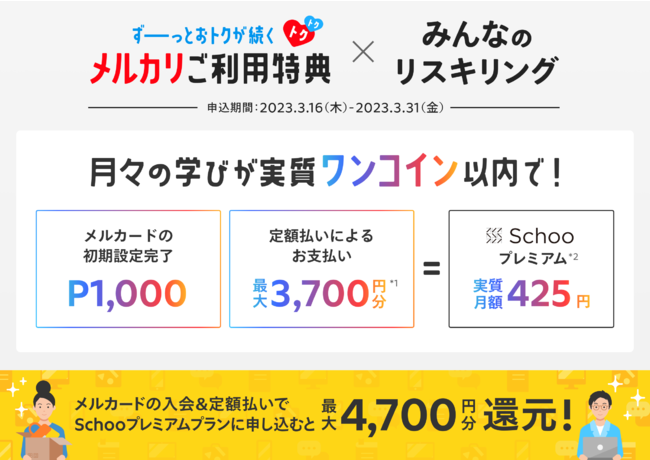「メルカリご利用特典」と特別特典の「みんなのリスキリング」を併用し、「メルカード」で決済することで、スクーの提供するオンライン学習サービス「Schooプレミアム」が実質月額ワンコイン以内で受講可能になります。