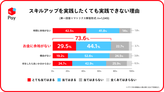 物価上昇下でのリスキリングについて、当社が実施した調査(※2)では「スキルアップを実践したいけど実践できていない」と回答した人に対して実践できない理由を訊いたところ、約73.6%の人が「お金に余裕がない」と回答しており、物価高の影響で家計負担が増える中、自己投資に向ける金銭的な余裕を持てない人が一定数存在することが分かりました。