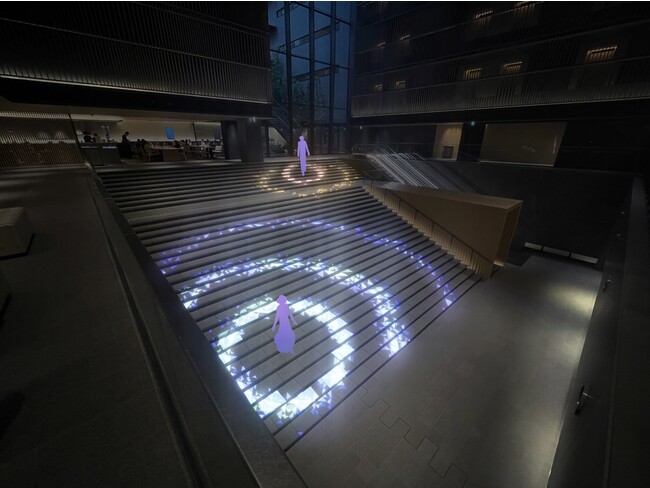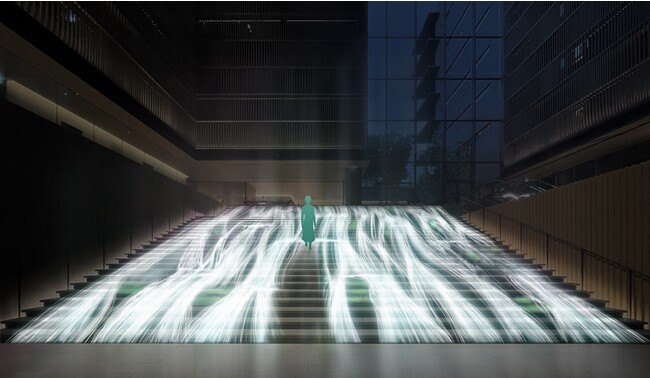 京都の涼やかな川の流れを、階段の勾配を生かして表現。訪れた人々の個性や多様性を可視化するように、ゲストの足元の水が形を変え、流れていきます。二十四節気に合わせて一筋の水流の色が変化します。