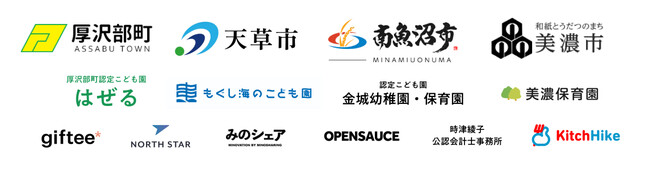 株式会社ギフティ(あっさぶe街ギフト・旅先納税(R)️連携)株式会社ノーススター(オンライン診療キッズドクター連携)みのシェアリング株式会社(美濃市でまちごとシェアオフィスWASITA MINOを運営)株式会社OPENSAUCE(保育園留学(R)️第1号家族所属)時津綾子公認会計士事務所(保育園留学(R)️第1号家族所属)株式会社キッチハイク(保育園留学(R)️運営)