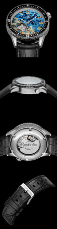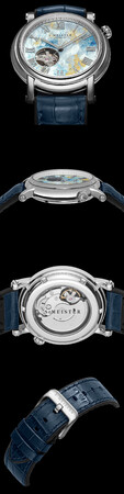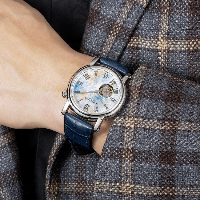白と水色のカラーグラデーションの中に、銀粉とゴールドカラーの銀粉が散りばめられた、煌びやかながらも爽やかで上品なデザインです。熟練の職人が1つ1つ丁寧に繊細な銀粉を使用し文字盤をデザインしています。ケースは流線が美しい、丸みを帯びたタイプに。ベルトは手入れがしやすいように、裏面にラバーを貼り付けたハイブリッドレザーを使用しています。