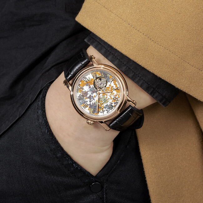 文字盤全体を『着色銀箔』で贅沢にデザインしたモデルです。日本の美しい山並みをイメージした褐色やモスグリーンの銀箔が美しく融合し、‟和”を表現。ケースは流線が美しいラウンドケースを採用。肌馴染みが良いとされるローズゴールドでIP加工されたステンレススティールのケースです。ベルトには、黒いハイブリッドレザーを採用し、華やかなカラーリングを引き締め、高級感あふれる腕時計へと昇華してくれます。