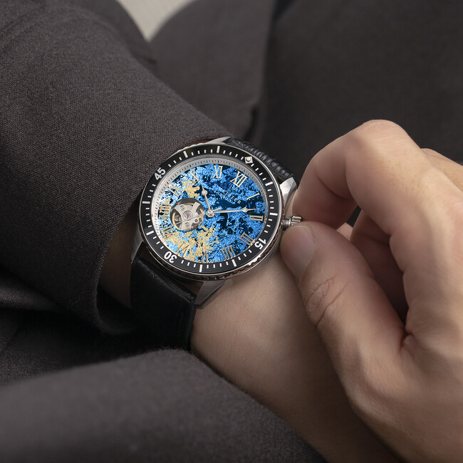 腕元に映える鮮やかな文字盤には青と黄の『着色銀箔』が使用されています。銀箔を燻す(いぶす)ことで様々な色彩の銀箔を作ることができ、鮮やかで豪華な輝きは銀箔ならではの美しさです。ケースはスポーティなデザインが多いダイバータイプを使用し、雅な‟銀箔“とアクティブな外観という意外な組み合わせが不思議とマッチしたモデルです。ベルトは手入れがしやすい、ハイブリッドレザーを使用しています。