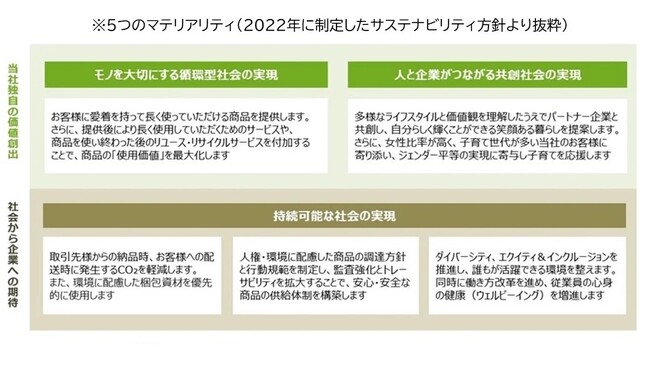 当社は、2022年に制定したサステナビリティ方針において、「モノを大切にする循環型社会の実現」、「人と企業がつながる共創社会の実現」、「持続可能な社会の実現」を掲げ、笑顔がつながる、よりよい暮らしと未来の創造を目指し、5つのマテリアリティ※を設定しました。その中で愛着ある商品開発を行い、商品の価値を最大化するためのサービスを提供し、事業活動と連動させながらサステナビリティ活動を推進しております。