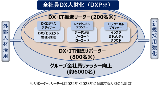 サッポロホールディングスは、昨年よりグループの DX 方針を推進するため「全社員 DX 人財化」を目指す DX・IT 人財育成プログラムを実施しています。研修ステップを「全社員ステップ」「サポーターステップ」「リーダーステップ」の 3 段階に分ける形で構成し、本年の全社員ステップでは、受講対象者を昨年比1.5 倍の約6,000名に拡大するなど、早期に DX・IT 案件を推進できる体制構築を目指しています。