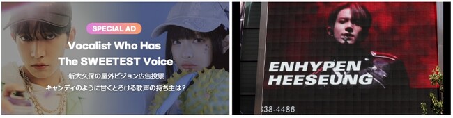 2023年2月22日(水)から3月7日(火)までの期間で開催した、「キャンディのように甘くとろける歌声の持ち主は?」の投票において1位に選ばれたENHYPENのHEESEUNGの応援広告が、新大久保のK-PLAZA 1号館の屋外ビジョンで上映されます。■上映場所東京都新宿区百人町2-1-1 K-PLAZA 1号館屋外 K-ビジョン(JR山手線 / 新大久保駅 徒歩約3分)■上映スケジュール