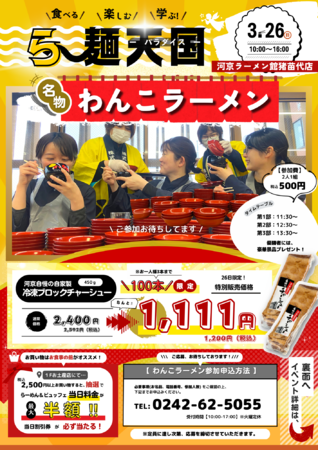 株式会社河京 ラーメン館猪苗代店(本社:福島県喜多方市、代表取締役:佐藤富次郎)は、3月26日(日)「ら~麺天国(パラダイス)」を開催します。