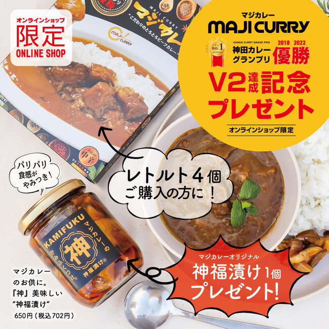 多くの人に食べていただき、マジカレーレトルトの美味さを知っていただきたい、その想いから昨年末オンラインショップでマジカレー4箱購入でマジカレーオリジナル福神漬け『神福漬け』1瓶プレゼントのキャンペーンを行ったところ、想像できないほどの多くのご注文をいただき、短期間での販売終了となりました。