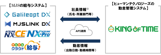 今回のAPI連携により、MJSの給与システムと『KING OF TIME』に登録された社員情報の相互連携が可能となるほか、『KING OF TIME』に登録された勤怠情報をワンクリックでスムーズにMJSの給与システムに自動連携することができます。