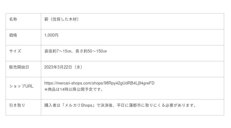 株式会社ソウゾウ(以下、ソウゾウ)の運用する、スマホ1つで誰でも簡単にネットショップを開設できるEコマースプラットフォーム「メルカリShops」を活用し、愛知県蒲郡市が市内で伐採された木材を活用した“薪”の販売を開始いたします。また、同日より役目を終えた市の備品等の販売も実施します。