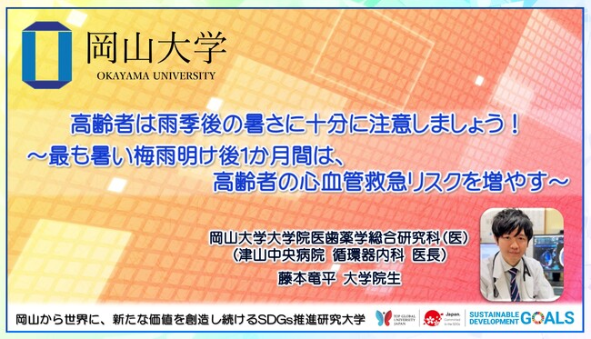 【岡山大学】高齢者は雨季後の暑さに十分に注意しましょう!~最も暑い梅雨明け後1か月間は、高齢者の心血管救急リスクを増やす~