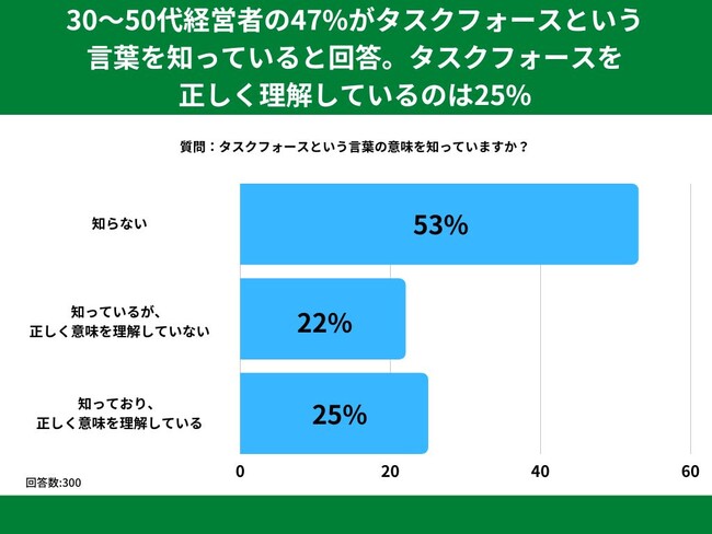 30代~50代の男女を対象とした「タスクフォースという言葉の意味を知っていますか?」というアンケートで最も多かった回答は「知らない」で53%でした。