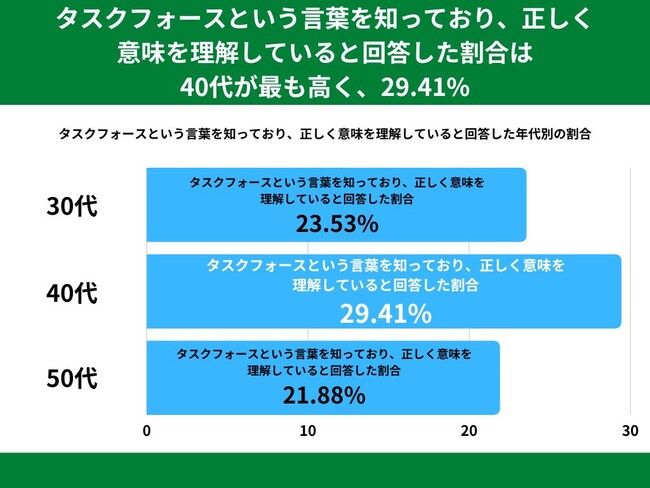 タスクフォースという言葉を知っており、正しく意味を理解していると回答した割合を年代別でみてみますと、40代が最も高く29.41%、次いで30代が23.53%、50代は21.88%という結果になりました。