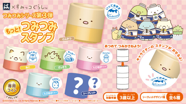 重ねて飾ることができるつみつみシリーズ第3弾では、すみっコたちがデザインされた「もっと!つみつみスタンプ」を展開します。今回は、“みにっコ”から初登場の「ざっそう」と「たぴおか(ピンク)」、「たぴおか(ブルー)」、シークレットデザインなどを含む全6種類をご用意しており、どのキャラクターが出るかはお楽しみです!