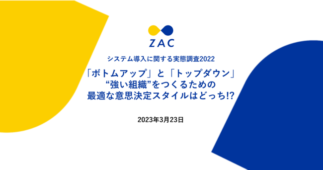 システム導入の“真の決定者”は「システム部長」であることを明らかにするとともに、 2023年1月に行った二次分析調査では、システム導入の際に「つまずく6つの失敗」があることを明らかにしています。今回は、「ボトムアップ企業」「トップダウン企業」それぞれにおいて、“導入プロセスにかかる時間”や“導入までのスムーズさ”に関する二次分析を行いました。会社経営の意思決定スタイルとして用いられる「ボトムアップ」と「トップダウン」のどちらがより組織の成長や活性化につながるかを考察しています。