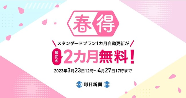 毎日新聞社(代表取締役社長執行役員:松木健)のニュース配信サービス「毎日新聞デジタル」 は23日から、スタンダードプランの「1カ月自動更新」が最初の2カ月無料になる「春得」キャンペーンを開始しました。手軽に利用できる人気のスタンダードプランが対象のお得なキャンペーンです。ぜひこの機会にご利用ください。
