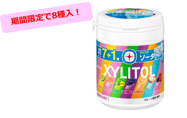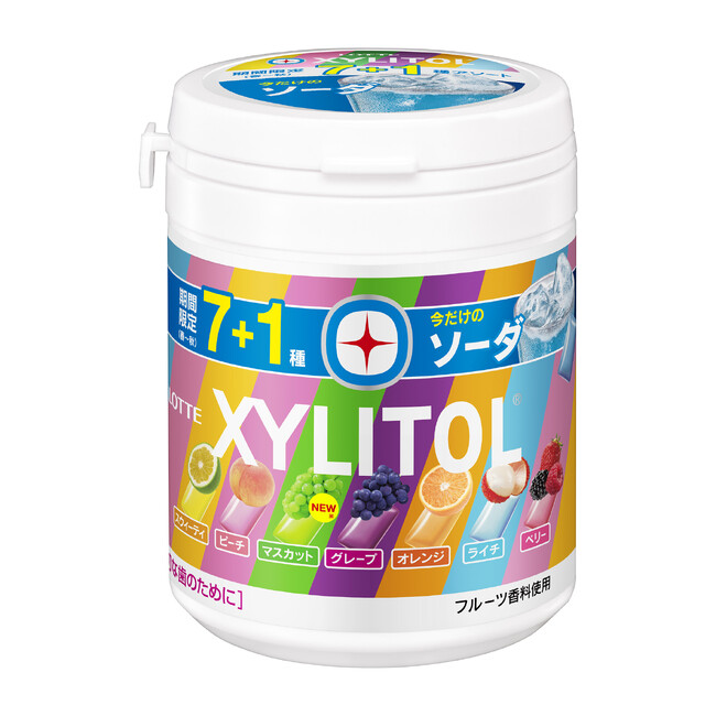 グレープ・ピーチ・マスカット・スウィーティ・ベリー・オレンジ・ライチの7種類のフレーバーに、期間限定で「ソーダ」味が加わって8種類のフレーバーが楽しめます。また「マスカット」味はガムの外側の糖衣部にビタミンCを配合した品質にリニューアル。それぞれの香りとキシリトールらしい爽やかな味わいをお楽しみいただけます。
