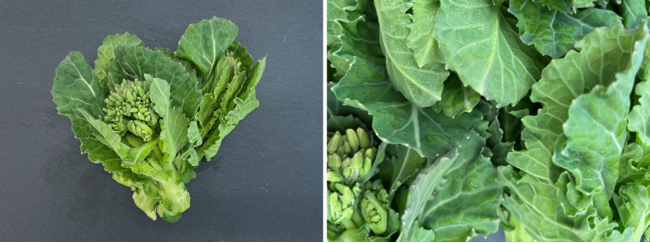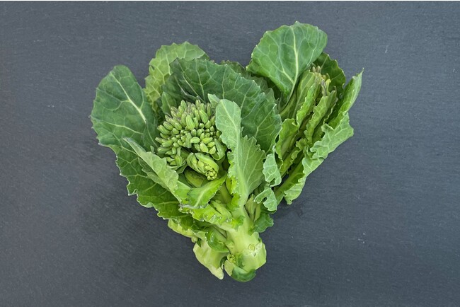 「ケール花芽」は同じアブラナ科の春の味覚「菜の花」に近い味わいで、ケールの葉よりえぐみ(青菜特有の強い味)が少なく、その分旨味や甘みが感じられやすい特長があります。小さなつぼみや茎、葉はどれも柔らかく、さっと火を通すことで一層甘さが引き立ちます。