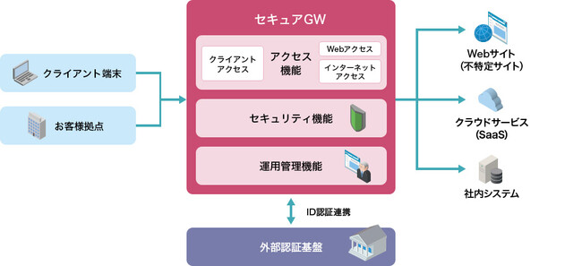 「セキュアGW」では、アクセス機能、セキュリティ機能、運用管理機能を提供します。これにより、ID認証やWebプロキシを介したインターネット接続が可能になり、不正アクセスやマルウェアなどの脅威からお客様環境を守ります。