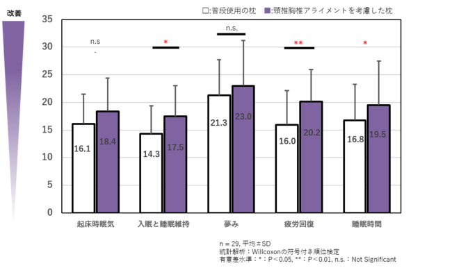頸椎胸椎アライメントを考慮した枕を使用した睡眠は、普段使用している枕に比べ、入眠と睡眠維持、疲労回復などの睡眠感を改善することが示唆されました。